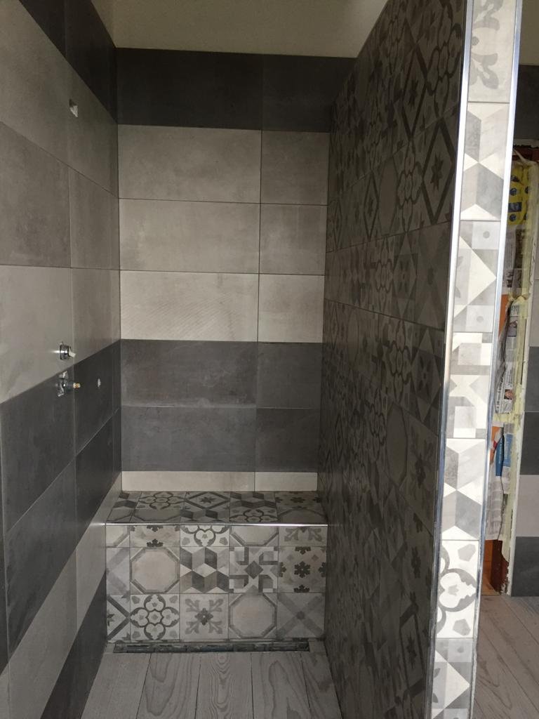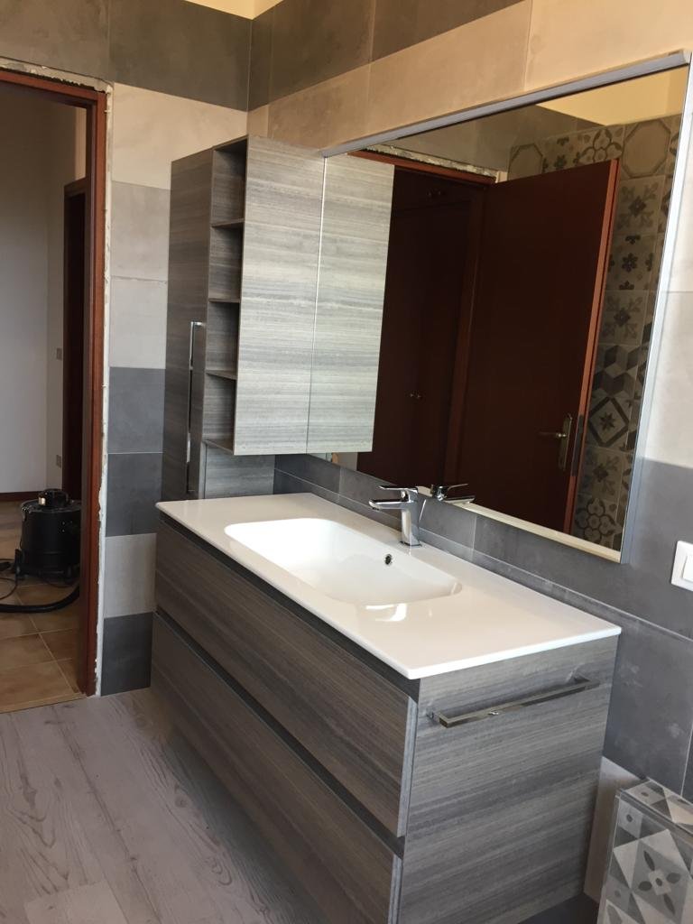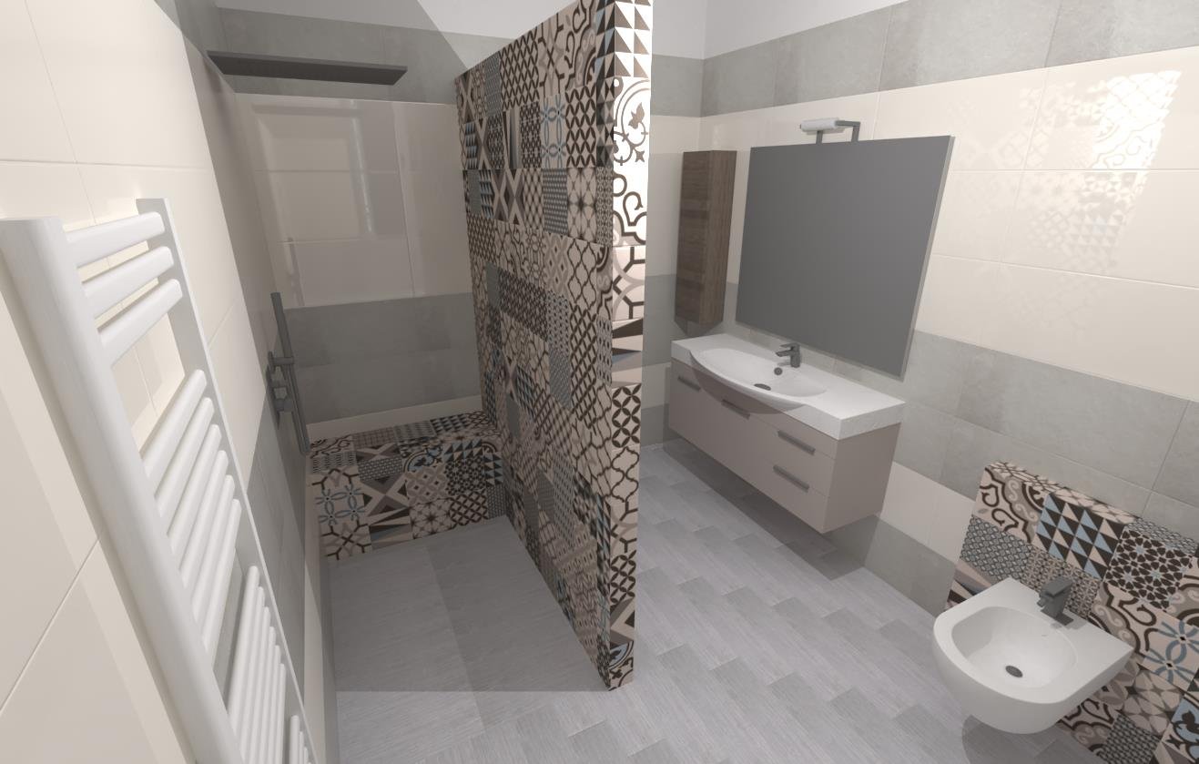 Rifacimento completo del bagno partendo dalla nostra consulenza tecnica accompagnata da disegni tecnici e fornitura di pavimento, rivestimento, sanitari sospesi con rubinetteria varia, piatto doccia in opera con soffione moderno, e termo arredo.